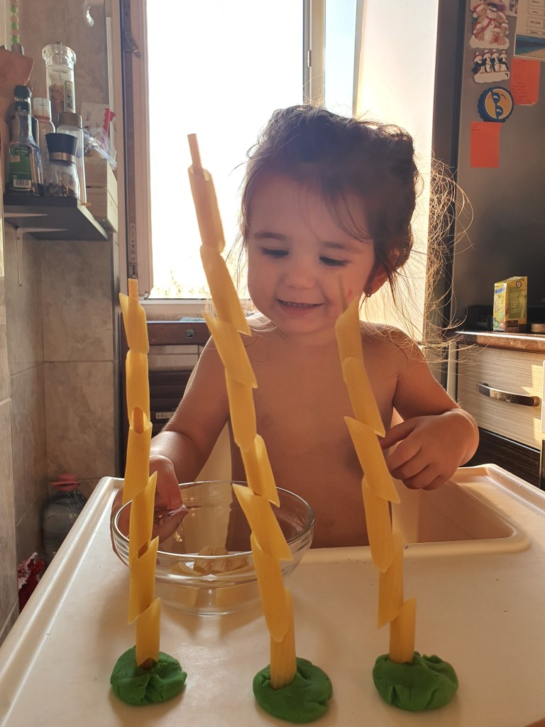 Se fac cateva  grămăjoare din plastilina, in care infingem cate o spagheta. După care,minunea din dotare, ne va arata cat de bine se descurca in a insirui pastele pe  fiecare spagheta,numarandu-le. Chiar e fun!