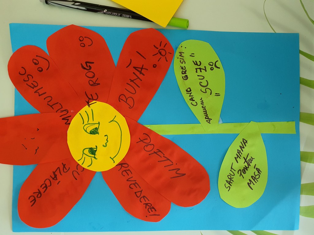 Desi la aceasta varsta sunt destul de micuti,o floare ii poate mentine atenti pentru o perioada mai lunga de timp .Floarea poate avea orice alt subiect decat bunele maniere,trebuie doar pregatit in avans,pentru a nu plictisi micutul .Daca avem hartie glasata in casa,o vom folosi,daca nu,ne apucam de colorat  si decupam ceea ce vor fi petalele, un cerc,2 frunze si o tulpina,pe care vom adauga mesaje. Micutul nostru ne va ajuta in activitatea de lipire,cand ii vom explica mai pe larg subiectul ales.