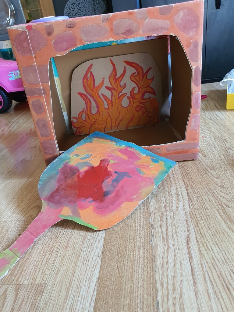 Aveti nevoie de o cutie mai maricica pe care sa o decupati asa cum va pricepeti mai bine , dupa care,impreuna cu cel mic,veti picta cateva pietre(conturul  va reveni in reponsabilitatea dvs ).Separat,veti decupa un alt carton in forma de flacari,pe care il veti picta cum va pricepeti voi mai bine . Daca va mai ramane carton,creati si paleta pt a nu va „frige” cand scoateti bunatatile din plastilina din cuptor 🙂