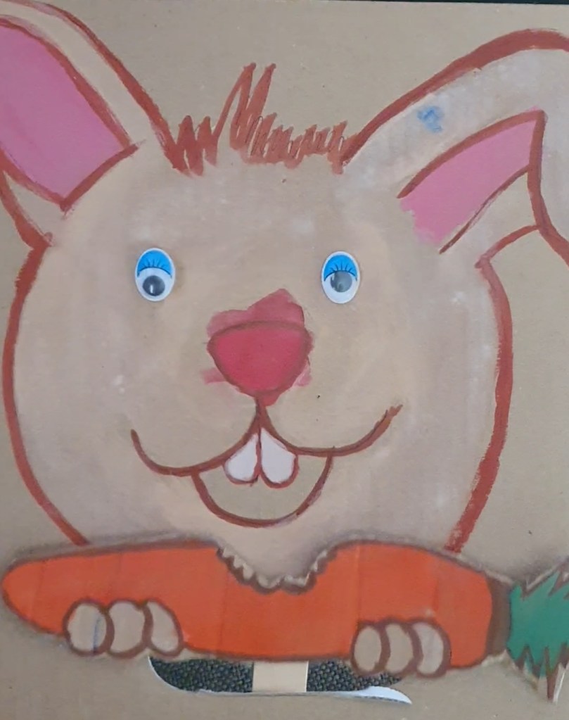 Aveti nevoie de carton,un bat de la o inghetata si pricepere .Vom desena un iepuras, iar in dreptul labutelor,vom decupa o gaura,astfel incat sa ne incapa un bat de inghetata .  Separat,desenam un morcov cu o mușcătura pe el, pe care il vom lipi de batul sus mentionat .Introducem batul cu morcov in gaura facuta,iar cu miscari sus jos,va parea ca iepurasul roade un morcov. Tare,nu?