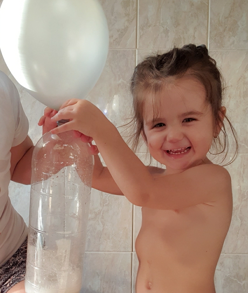 Se ia o sticla de 2l, se pune otet in ea , o lingura de bicarbonat (sau mai mult) se pune un balon pe gura sticlei, agitam un pic sticla,si gata- noi nu umflam balonul 🙂