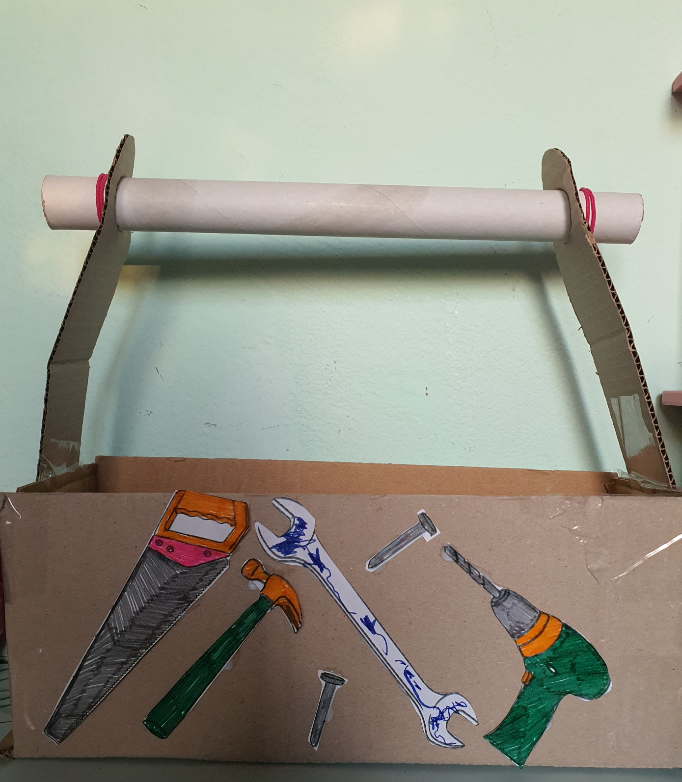 Daca se nimerește si cu ceva treaba de-a lui tati ,va fi perfect . Aveti nevoie de o cutie de carton,pe care o veti decupa, un tub  de la o rola de bucatarie ,mai decupati 2 bucati din carton pentru laterale,print ceva scule de pe net ,pe care le veti lipi pe fatada trusei  si gata,Mesterel isi poate ajuta taticul .In trusa puteți pune tot felul de chestii,mai ales daca aveti fetite :un tub de scotch, o șurubelnița,trusa de doctor ,orice .
