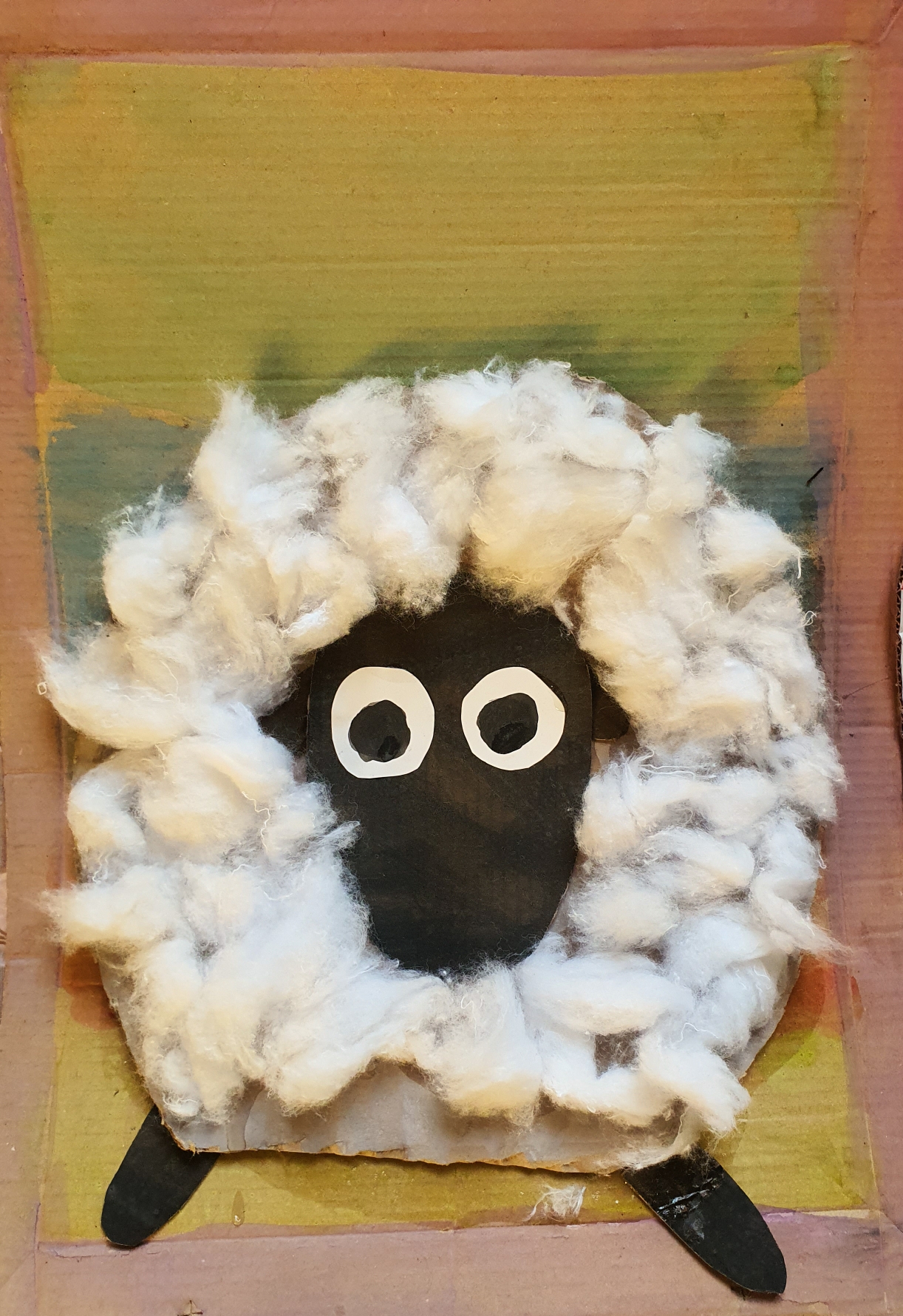 In prima faza,veti da fond cartonului/ramei pe care veti aseza oita. Apoi veti desena 2 urechi, 2 ochi,2 copite si conturul fetei,pe care le veti decupa. Le pictați le fiecare in parte,iar in timp ce se usuca,veti decupa din carton un cerc,pe care il veti poziționa peste rama, apoi veti da cercul cu lipici si veti aseza vata. Dupa ce e totul gata,lipiti capul oitei ,ochii,si piciorusele.Asta e tot!